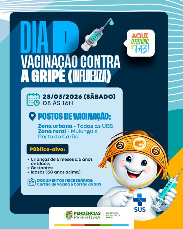Neste sábado (28/03), das 08h às 16h, acontece o Dia D de vacinação contra a gripe (Influenza) em Pendências. A ação será realizada em todas as UBS da zona urbana e, na zona rural, nas localidades de Mulungu e Porto do Carão. O público-alvo inclui crianças de 6 meses a 5 anos, gestantes e idosos […]