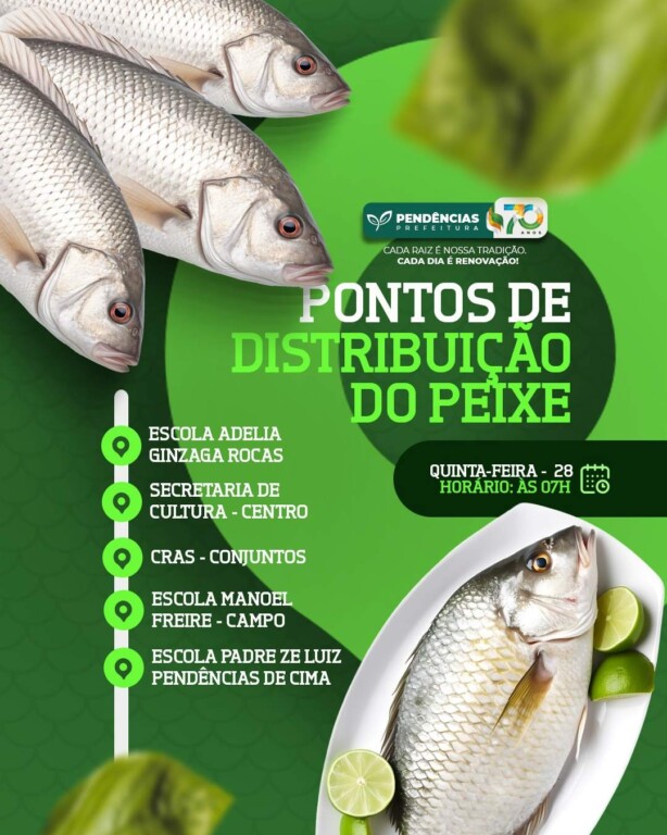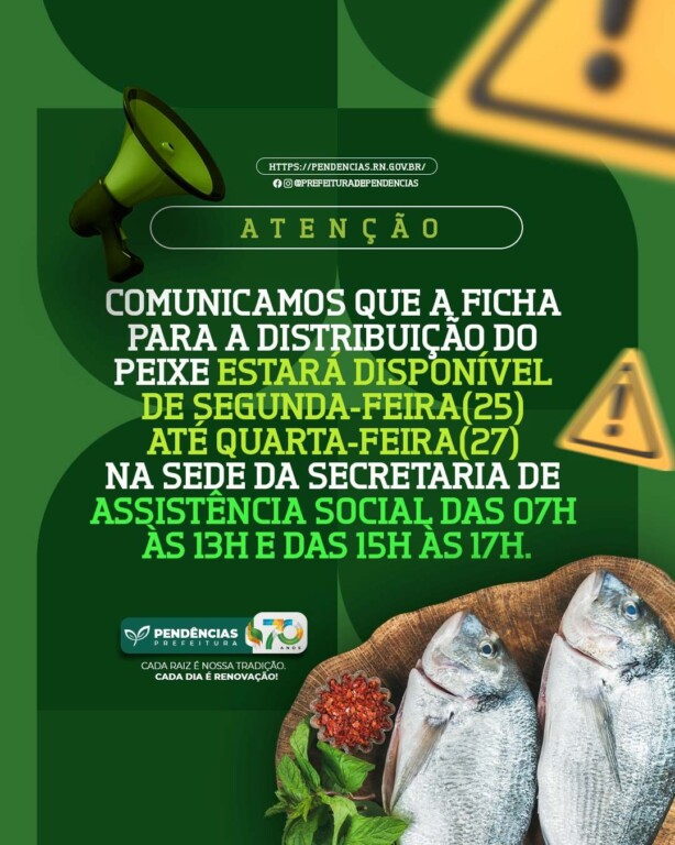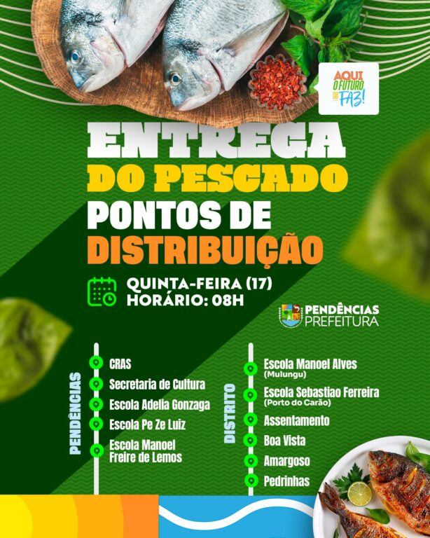 Amanhã (17/04) teremos a tradicional entrega do pescado da Semana Santa. é importante que todos confiram os pontos de distribuição com antecedência para garantir o recebimento dentro do horário previsto. Fiquem atentos às orientações e não deixem de verificar o local mais próximo de você!