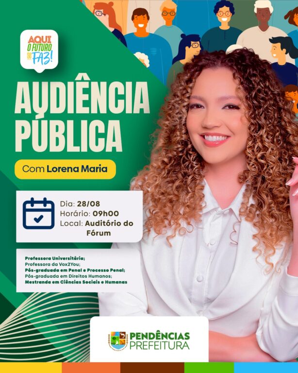 A PREFEITURA DE PENDÊNCIAS CONVIDA TODA A POPULAÇÃO! No próximo dia 28 de agosto, às 09h00, será realizada Audiência Pública com Lorena Maria, no Auditório do Fórum. 👉 Sua participação é fundamental para construirmos juntos uma cidade cada vez melhor. ✅ Venha, traga suas ideias e faça parte desse momento de diálogo e cidadania!