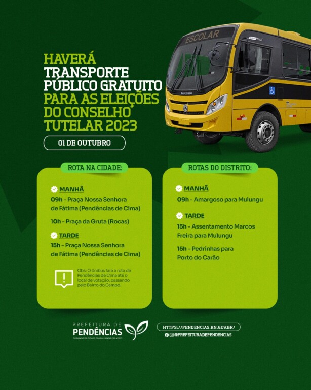 Prefeitura Municipal de Pendências disponibilizará transporte gratuito para as Eleições do Conselho Tutelar 2023