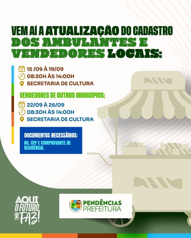 ATENÇÃO, AMBULANTES E VENDEDORES! A atualização do cadastro é essencial para garantir a organização, valorização e o fortalecimento do trabalho de todos. ✨ Não deixe de participar e manter seus dados em dia. Essa é uma forma de assegurar mais oportunidades e benefícios para quem faz parte do nosso comércio local.