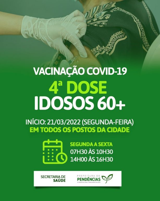 ATENÇÃO! Segunda-feira (21/03) estaremos vacinando os idosos acima de 60 anos com com a 4ª dose. Procure qualquer UBS’s para tomar a sua dose da vacina contra a Covid-19. Todos devem levar RG, CPF e Cartão de Vacina. #VacinaSIM #VivaoSUS #PrefeituraDePendências #CuidandoDaCidade #TrabalhandoPraVocê