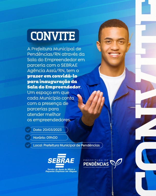 A Prefeitura Municipal de Pendências via Sala do Empreendedor em parceria com o SEBRAE, agência Assú-RN, tem o prazer em convida-lo para inauguração da sala do Empreendedor. Um espaço que contamos com a presença de parcerias para atender melhor os Empreendedores.