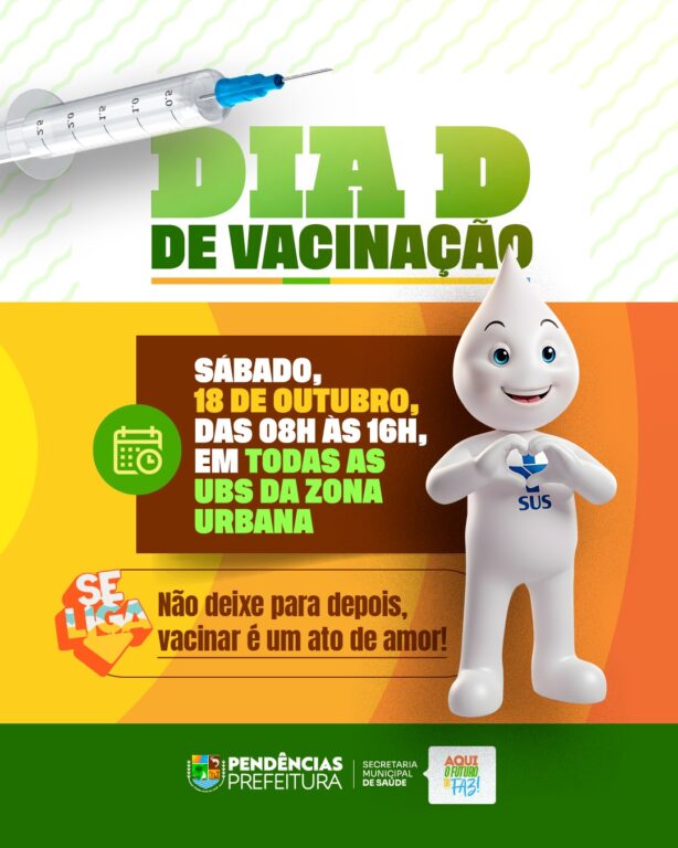 É DIA DE VACINAR, PENDÊNCIAS! Neste sábado, 18 de outubro, todas as UBSs da zona urbana estarão de portas abertas das 08h às 16h para o Dia D de Vacinação! 🙌 Traga seu cartão de vacina, chame a família e venha garantir a proteção de todos!