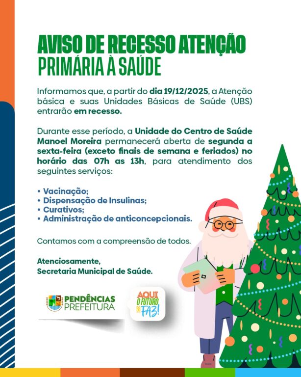 AVISO IMPORTANTE – ATENÇÃO PRIMÁRIA À SAÚDE Informamos à população que, a partir do dia 19/12/2025, as Unidades Básicas de Saúde entram em recesso. Durante esse período, a Unidade do Centro de Saúde Manoel Moreira seguirá funcionando de segunda a sexta-feira, das 07h às 13h (exceto finais de semana e feriados), garantindo os serviços de: […]
