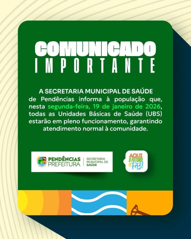A Secretaria Municipal de Saúde informa que todas as Unidades Básicas de Saúde (UBS’s) do município retomam o funcionamento normal nesta segunda-feira (19/01), com atendimento regular à população, garantindo a continuidade dos serviços de saúde e o cuidado necessário para todos os usuários.