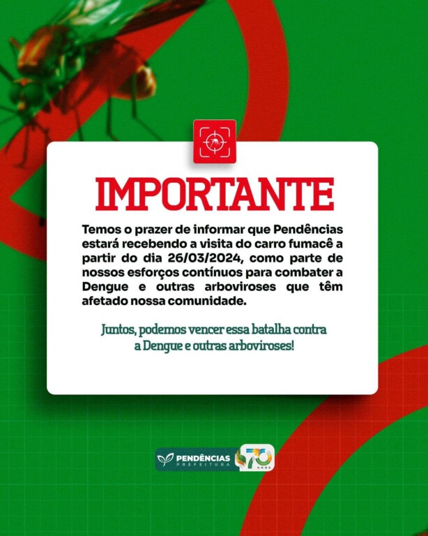 Diante o aumento de casos de Dengue e outras doenças causadas pelo mosquito, estamos Recebendo o Carro Fumacê de 26 á 04 de Abril