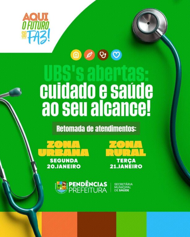 A Prefeitura Municipal de Pendências, em parceria com a Secretaria de Saúde, informa que as Unidades Básicas de Saúde (UBS) será reaberta nesta segunda-feira (20 de Janeiro), com o objetivo de retomar o atendimento à população de forma regular e eficiente. A reabertura visa garantir o acesso aos serviços de saúde essenciais, como consultas médicas, […]