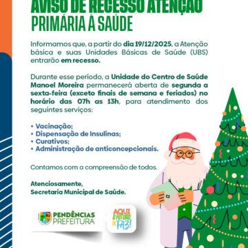 Informamos à população que, a partir do dia 19/12/2025, as Unidades Básicas de Saúde entram em recesso.