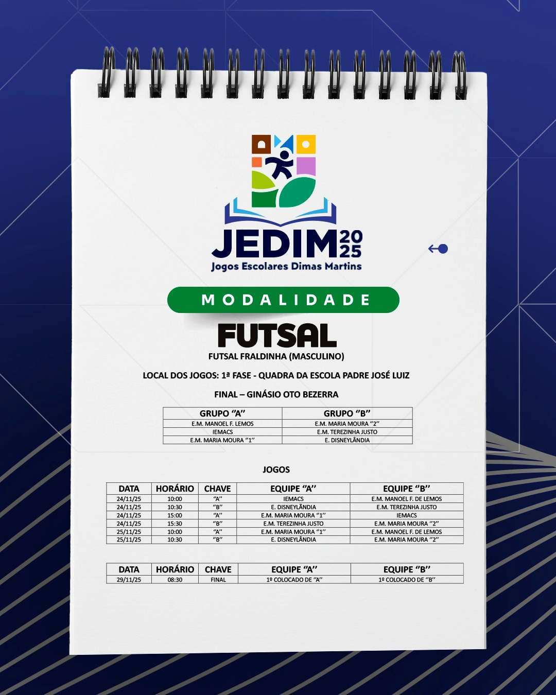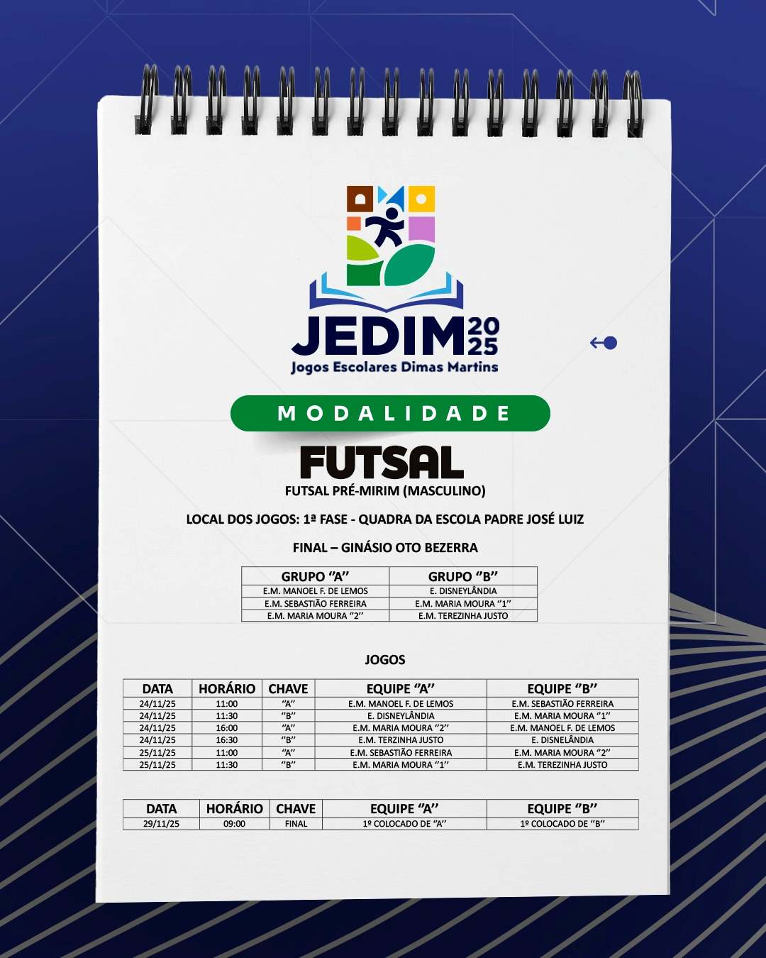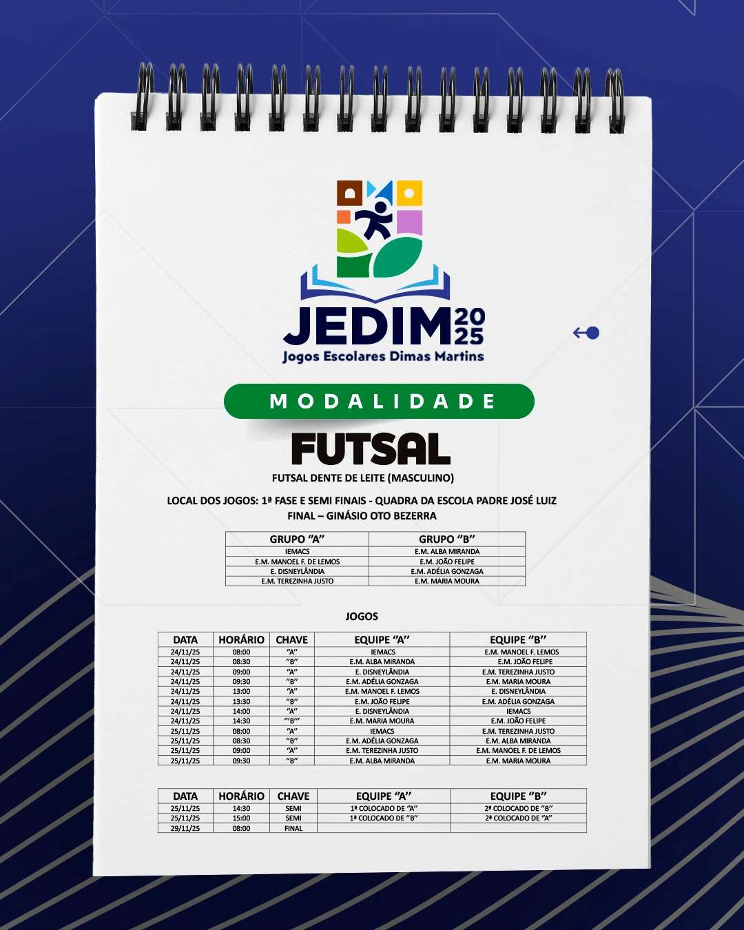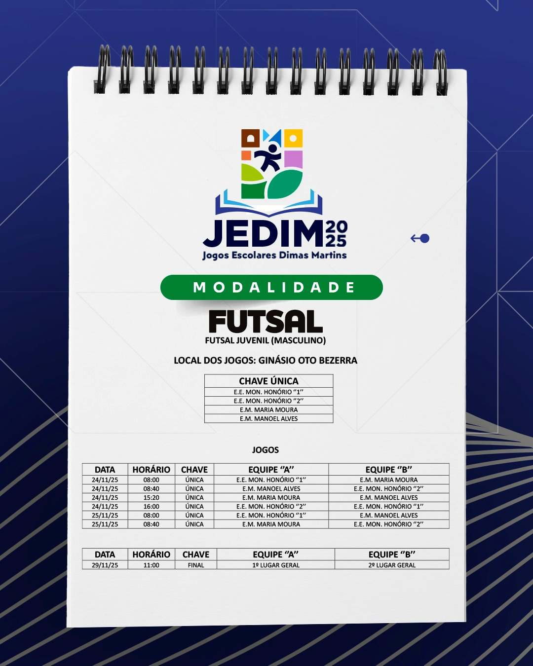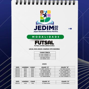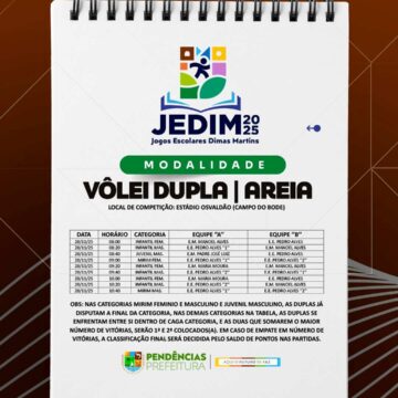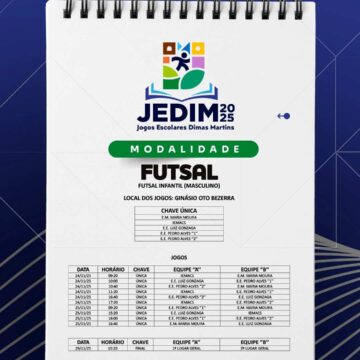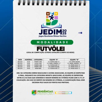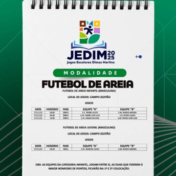 Os Jogos Escolares Dimas Martins terão início no próximo dia 24 e seguirão até o dia 29, reunindo estudantes em uma programação repleta de competições, integração e espírito esportivo; durante esses dias, diversas modalidades serão disputadas, promovendo não apenas o talento dos jovens atletas, mas também a convivência, o trabalho em equipe e a celebração do esporte como ferramenta de educação e cidadania.