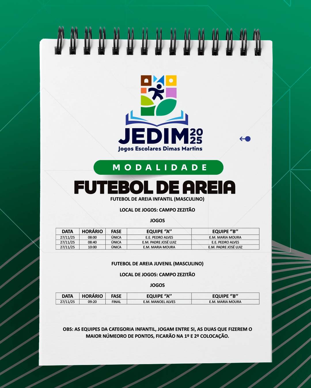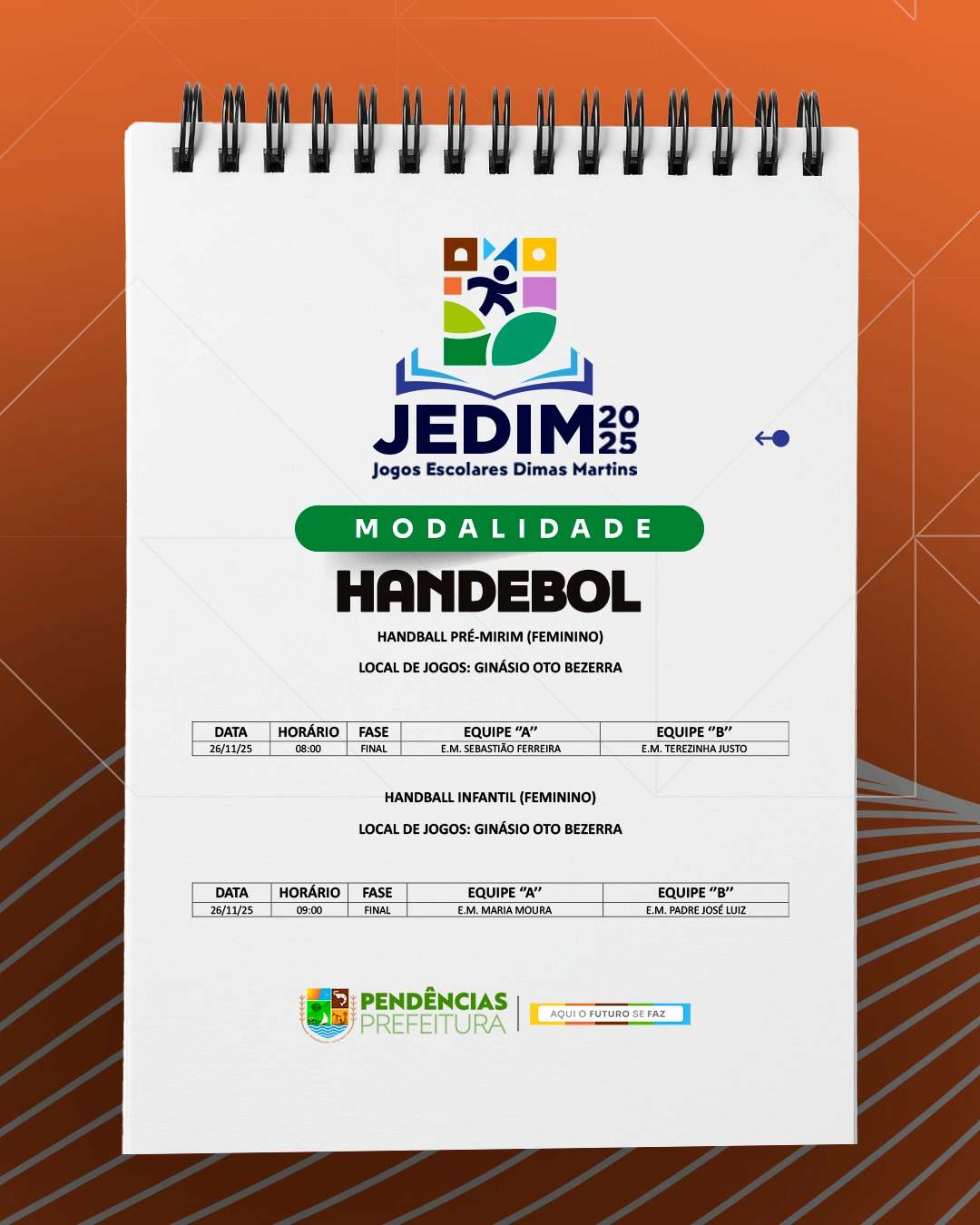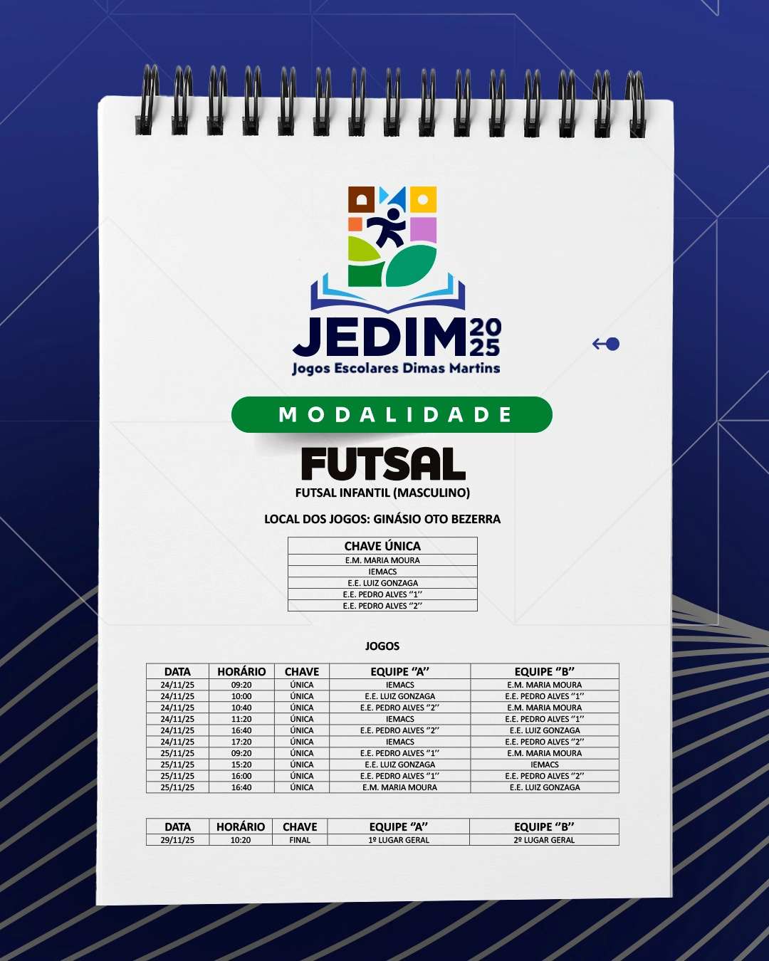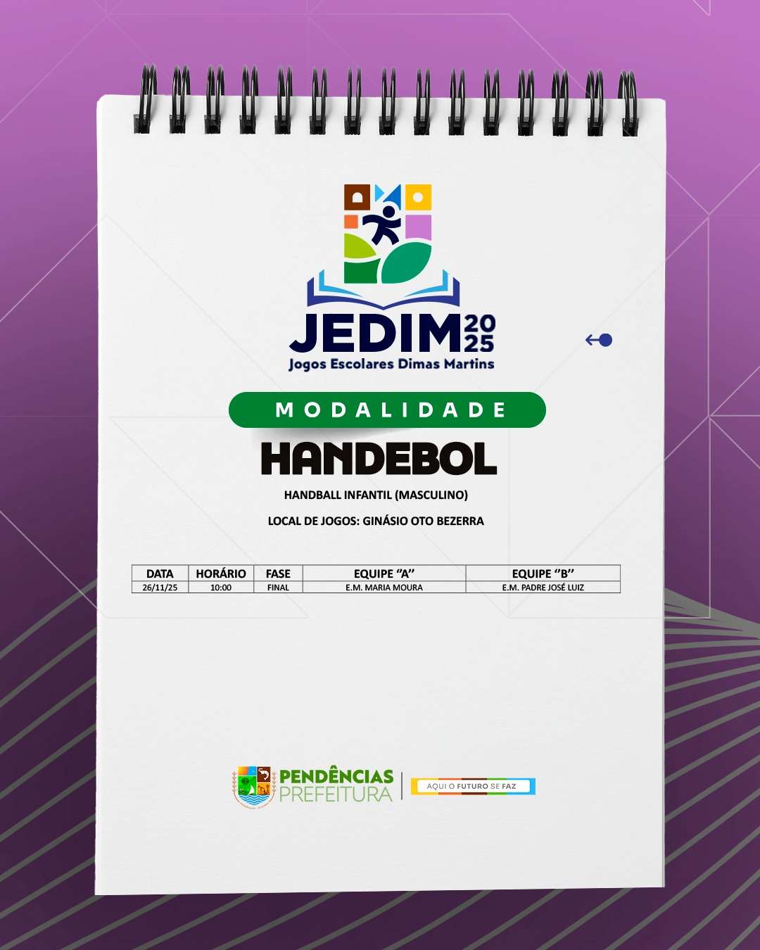 Os Jogos Escolares Dimas Martins terão início no próximo dia 24 e seguirão até o dia 29, reunindo estudantes em uma programação repleta de competições, integração e espírito esportivo; durante esses dias, diversas modalidades serão disputadas, promovendo não apenas o talento dos jovens atletas, mas também a convivência, o trabalho em equipe e a celebração do esporte como ferramenta de educação e cidadania.