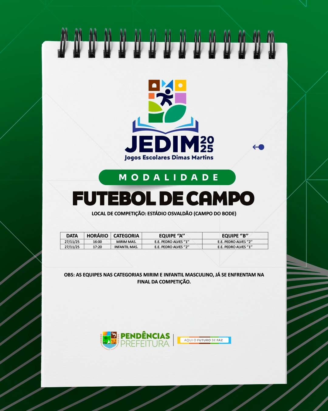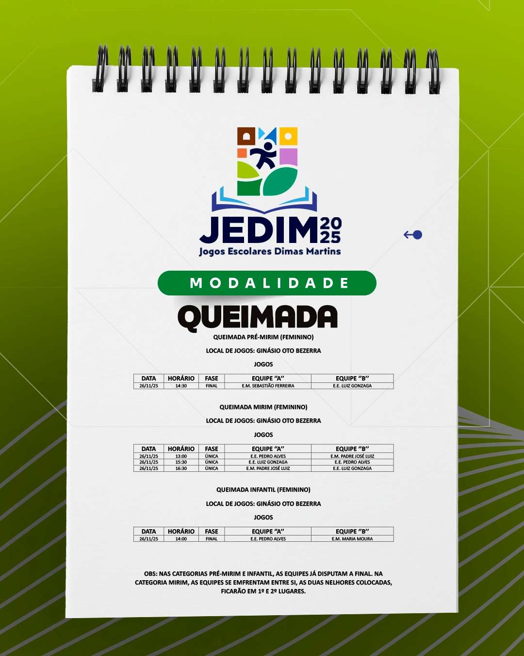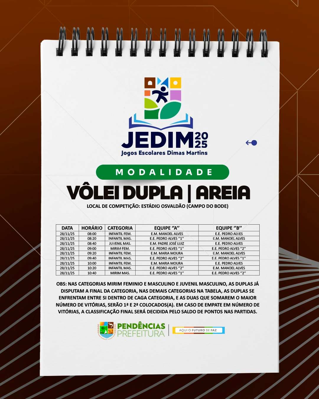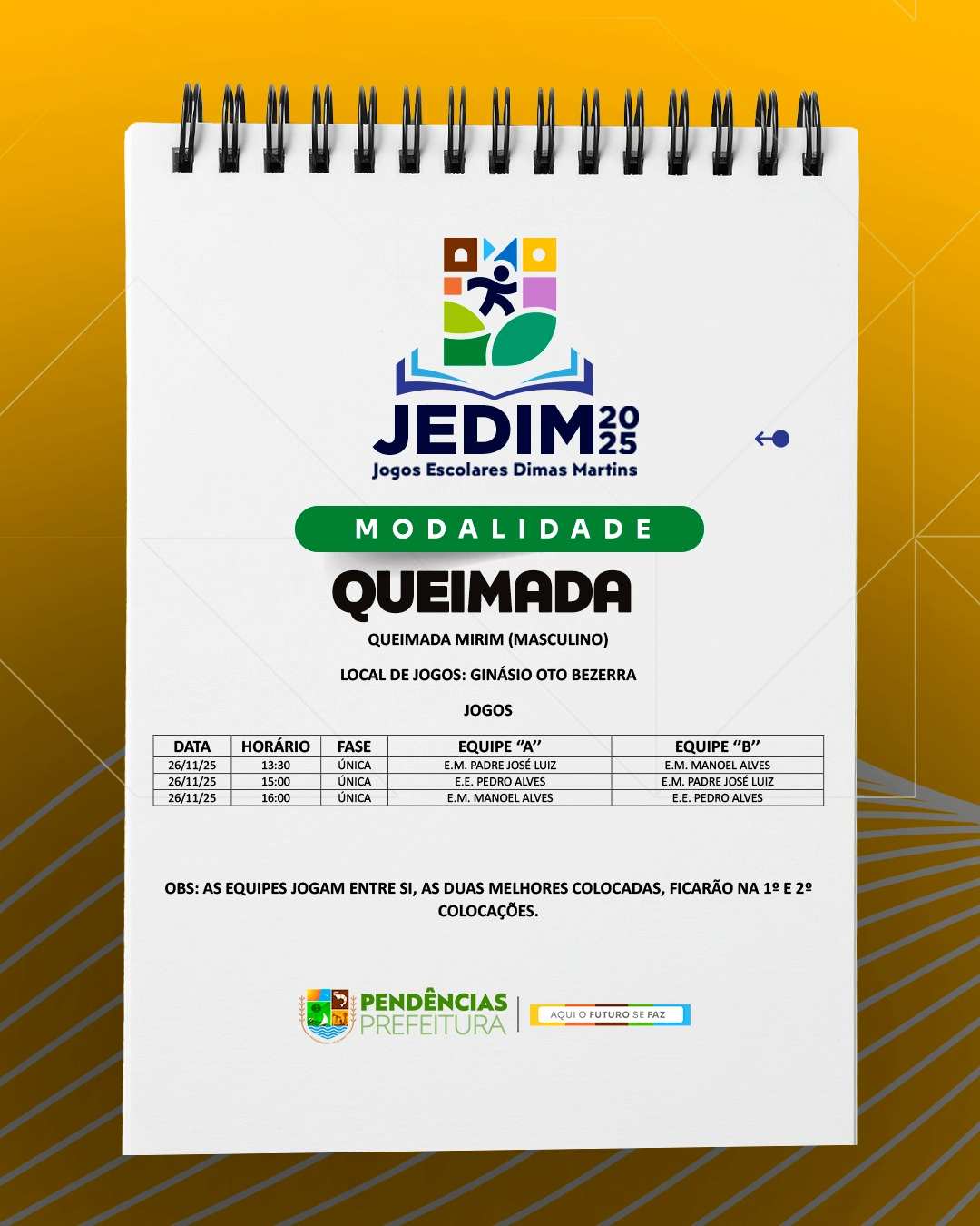 Os Jogos Escolares Dimas Martins terão início no próximo dia 24 e seguirão até o dia 29, reunindo estudantes em uma programação repleta de competições, integração e espírito esportivo; durante esses dias, diversas modalidades serão disputadas, promovendo não apenas o talento dos jovens atletas, mas também a convivência, o trabalho em equipe e a celebração do esporte como ferramenta de educação e cidadania.