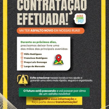 Prefeitura  Municipal informa que, nos próximos dias, importantes vias da nossa cidade receberão novo asfalto, melhorando a mobilidade urbana e a qualidade de vida da população. Para que esse trabalho seja realizado com segurança e agilidade, pedimos a colaboração de todos: evitem estacionar veículos nas ruas sinalizadas e respeitem as orientações das equipes no local. É um transtorno momentâneo que trará benefícios duradouros para todos!