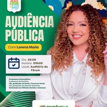 No próximo dia 28 de agosto, às 09h00, será realizada Audiência Pública com Lorena Maria, no Auditório do Fórum.