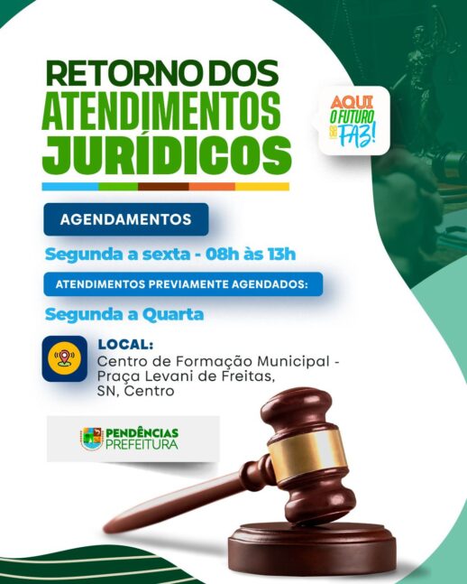 A Prefeitura de Pendências informa que os atendimentos jurídicos estão oficialmente retomados, garantindo à população acesso à orientação e acompanhamento nas demandas necessárias. Os agendamentos acontecem de segunda a sexta, das 08h às 13h, assegurando organização e melhor fluxo no atendimento.