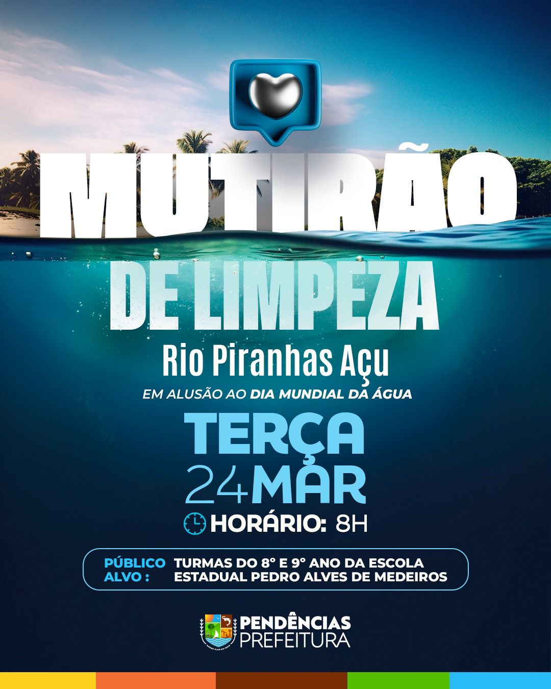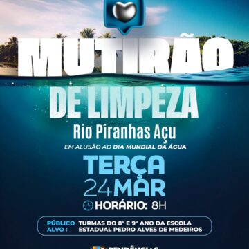 Nesta terça-feira (24), às 08h, será realizado um mutirão de limpeza no Rio, em Pendências de Cima, com a participação dos alunos do 8º e 9º ano da Escola Estadual Pedro Alves de Medeiros. A ação reforça a importância do cuidado com o meio ambiente e da preservação dos nossos recursos naturais.
