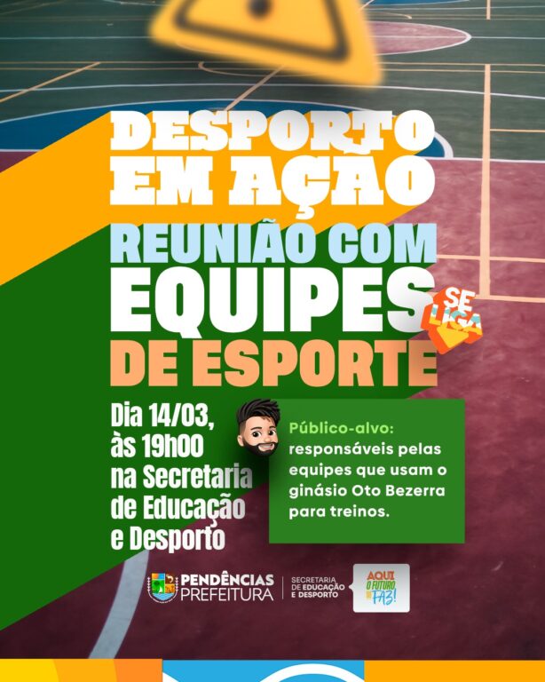 O esporte pendenciense está se preparando para mais uma grande edição do nosso campeonato! 💪 📣 Convidamos os representantes das equipes de Futebol de Campo Masculino para uma reunião sobre o início da competição. 📅 Data: 23/10 (quinta-feira) 🕖 Horário: 19h 📍 Local: Secretaria Municipal de Educação e Desporto