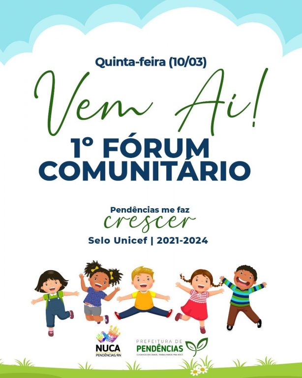 Na próxima quinta-feira (10/03) acontece o 1º Fórum Comunitário do Selo Unicef 2021-2024. Não deixe de participar! #PrefeituraDePendências #CuidandoDaCidade #TrabalhandoPraVocê