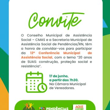 O Conselho Municipal de Saúde convida toda a população para participar da Conferência Municipal de Assistência Social, que este ano traz como tema “20 anos do SUAS: Comemorar, Avaliar e Avançar na Consolidação da Assistência Social como Direito”. Será um momento importante de diálogo e construção coletiva, onde juntos poderemos refletir sobre os avanços, desafios e perspectivas do Sistema Único de Assistência Social em nosso município. Participe e contribua com esse debate essencial para o fortalecimento das políticas públicas!