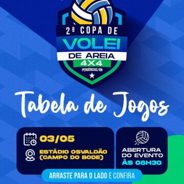 A Prefeitura de Pendências convida toda a população para prestigiar a 2ª Copa de Vôlei de Areia 4×4, um evento que valoriza o esporte, incentiva a participação e promove momentos de integração e lazer.