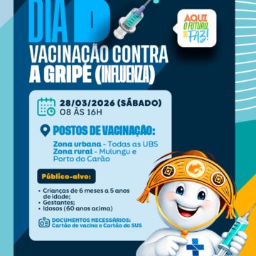 Neste sábado (28/03), das 08h às 16h, acontece o Dia D de vacinação contra a gripe (Influenza) em Pendências. A ação será realizada em todas as UBS da zona urbana e, na zona rural, nas localidades de Mulungu e Porto do Carão.