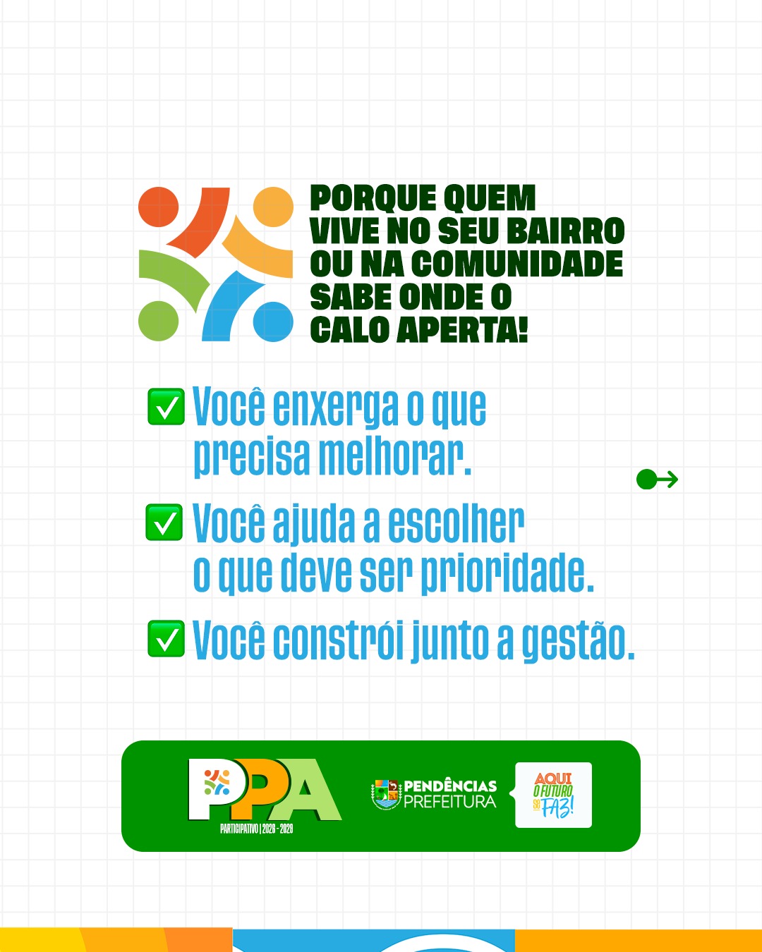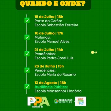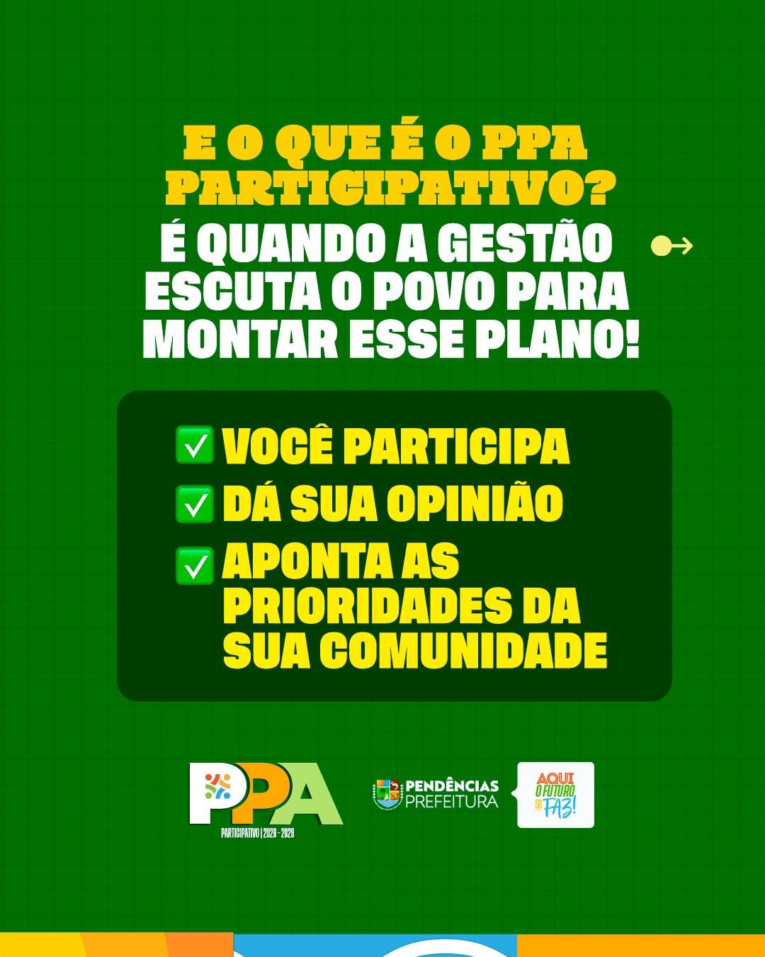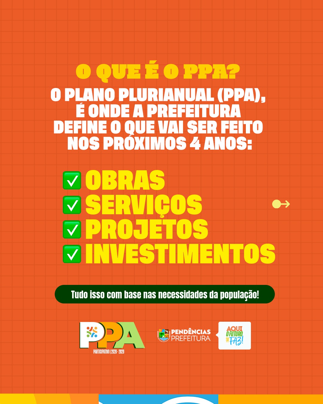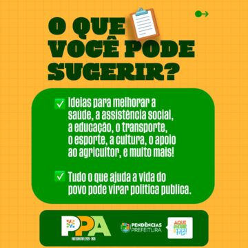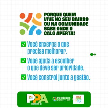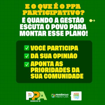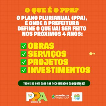 Vem aí o PPA – Plano Plurianual! É por meio dele que a Prefeitura define as metas e prioridades para os próximos quatro anos, planejando com responsabilidade as ações, investimentos e políticas públicas que vão transformar a cidade. Essa é uma etapa fundamental para garantir que as decisões atendam às reais necessidades da população e construam um futuro melhor para todos.