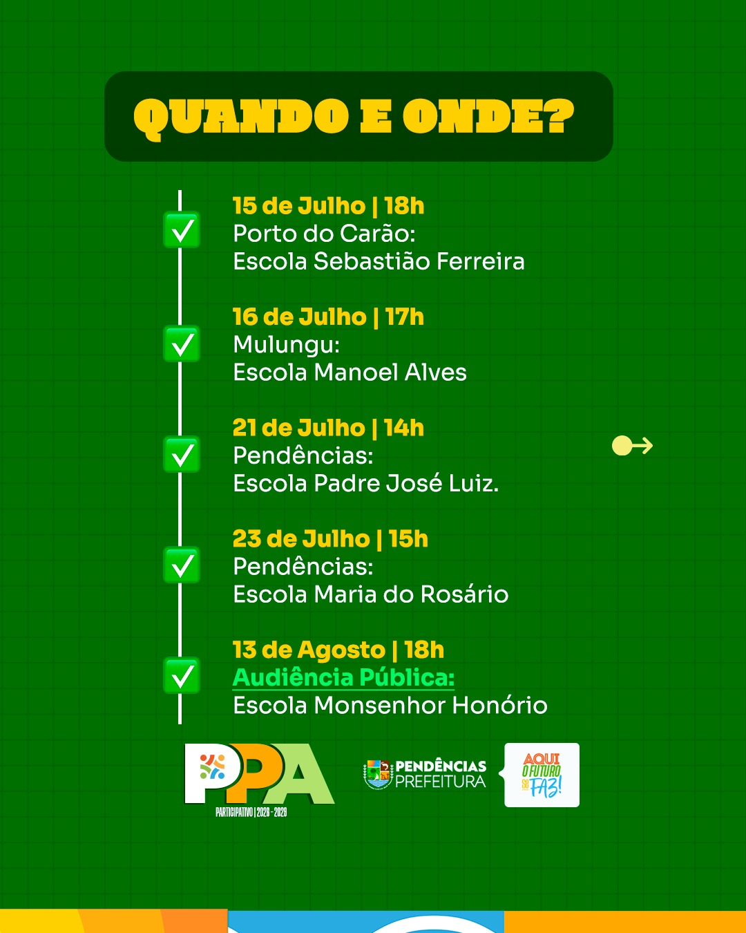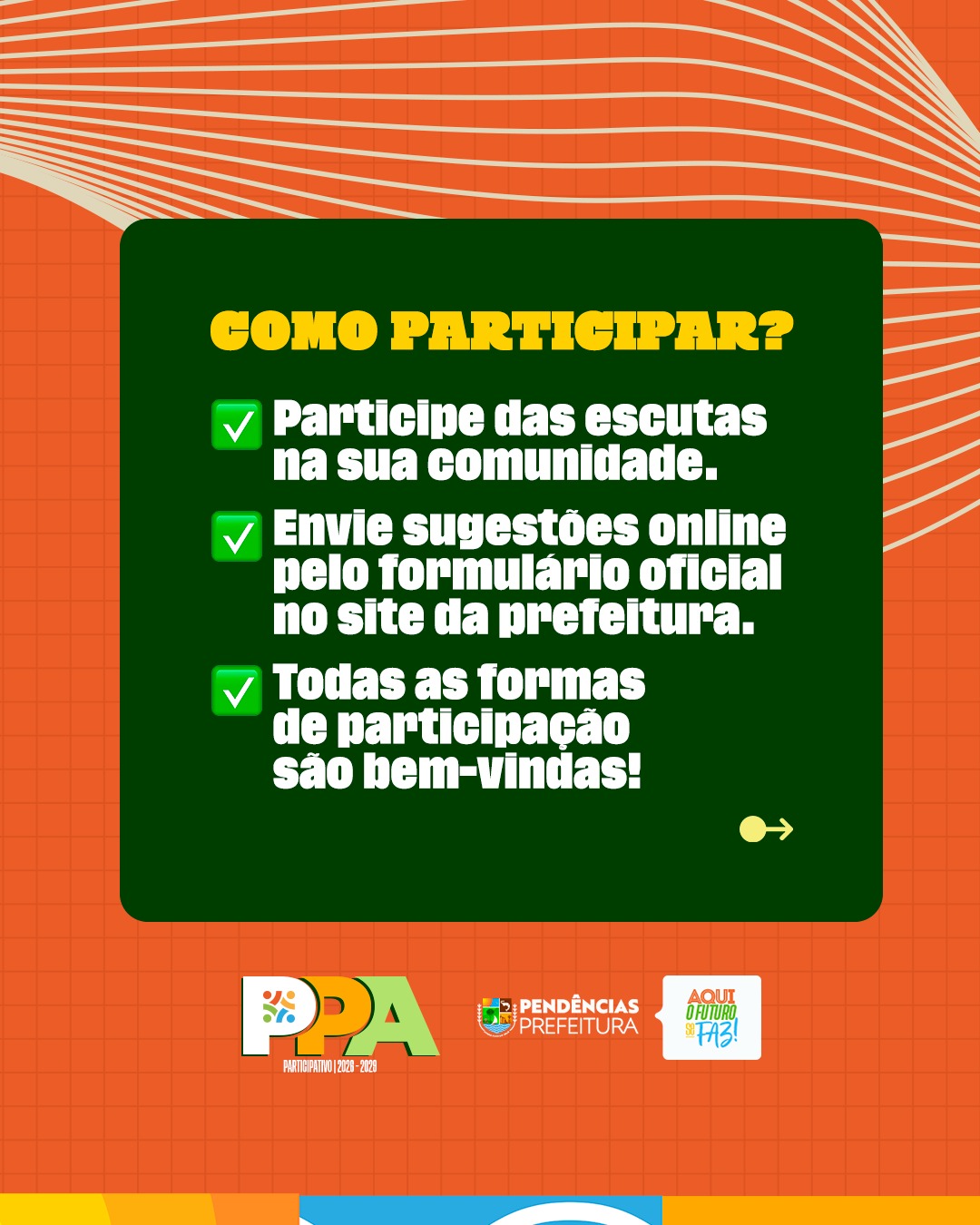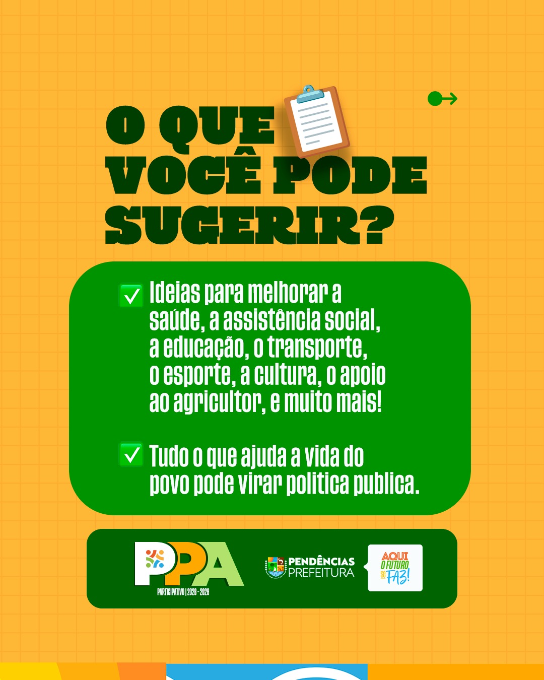 Vem aí o PPA – Plano Plurianual! É por meio dele que a Prefeitura define as metas e prioridades para os próximos quatro anos, planejando com responsabilidade as ações, investimentos e políticas públicas que vão transformar a cidade. Essa é uma etapa fundamental para garantir que as decisões atendam às reais necessidades da população e construam um futuro melhor para todos.